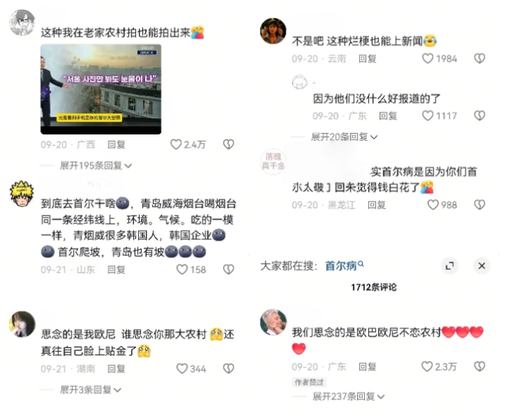 韩国媒体关于“首尔病”的报道传回中文互联网后,很快就引起了更多的质疑。有网友感慨,这种梗也能上新闻,被其他人回复因为韩国没有什么好报道的。有网友调侃,其实“首尔病”是因为去过之后发现首尔太破,感觉钱白花了。还有网友直接言明,青岛、烟台、威海和首尔在同一纬度上,环境、气候,都大差不差,还有很多的韩国企业,甚至连首尔爬坡,在青岛都能复刻,去韩国玩就是一次简单的旅游,没有必要强加那么多的滤镜。甚至有追星的网友现身说法,我只是思念自己喜欢的明星,和首尔这个城市没有关系。