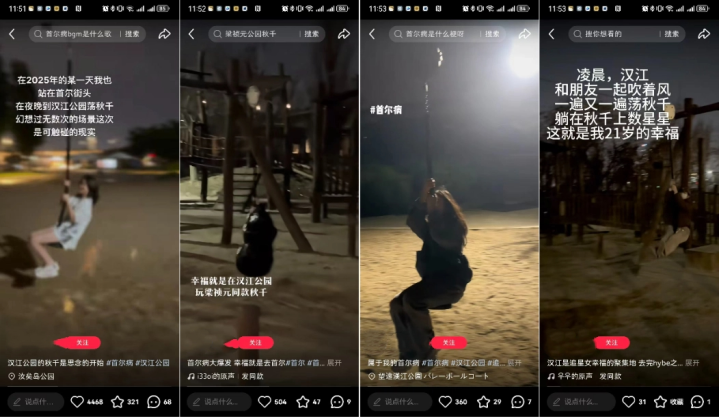 “首尔病”真正的走红起始于一个荡秋千的短视频,创作者上传了自己在韩国首尔汉江公园玩索道秋千(注:汉江公园的索道秋千是追星人士的网红打卡地,很多韩国偶像明星来过这里)的视频,配有非常感伤的背景音乐并打上了“首尔病”的标签。