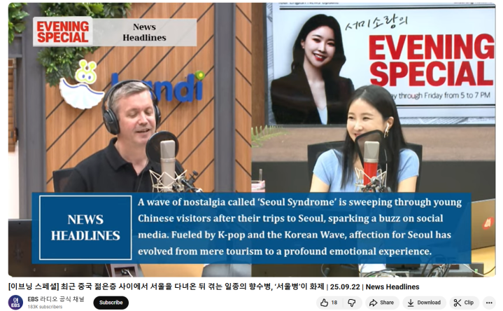 韩国教育广播公司EBS在一档名为《EveningSpecial》的节目中,用英文向全世界宣传,“首尔病”在中国各地蔓延,中国游客从首尔旅游回来后,在韩国流行音乐和韩流文化的推动下,对韩国的喜爱已经从普通旅游进化成为深入的情感体验,并称“首尔病”一词已经成为了中文互联网的热搜。末了,两位主持人在节目结尾处还不忘“提醒”,大量涌入的中国游客可能会产生不文明的行为,这让人担心会对当地的居民产生何种影响。